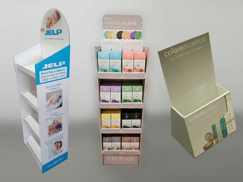 Standy reklamowe, w tym standy półkowe, zazwyczaj wykonane są z tektury falistej. Najczęściej stosowaną falą jest fala EB o gramaturze 800g, charakteryzująca się odpowiednią sztywnością i wytrzymałością, co czyni ją idealnym materiałem do produkcji ekspozytorów. W razie potrzeby możemy dodatkowo wzmocnić boki standu i półki tekturą falistą BC. Tak uzbrojony display wytrzyma bez problemu obciążenie 100 kg i więcej.